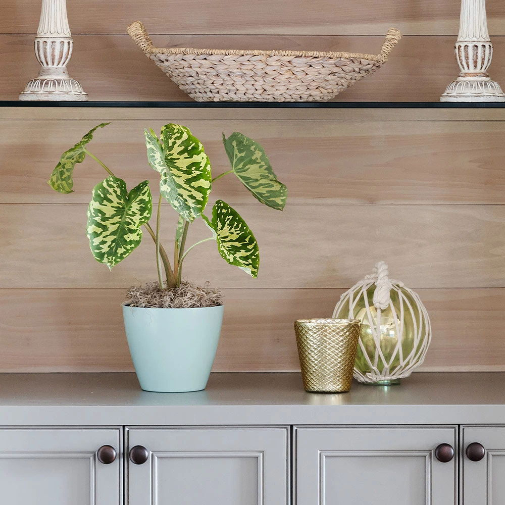The Hilo Beauty, a close relative of the Alocasia, is immediately recognizable for its large, impressive foliage. The green, heart-shaped leaves are embellished with an irregularly shaped speckled or camouflage pattern, paired with dark bluish-black stems. Each leaf is unique, and no two are the same. This family of plants is often called Elephant Ears, since its foliage resemble the large ears of an elephant!