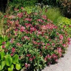 The addition of the Peaches and Cream Honeysuckle will transform your garden into a wildlife sanctuary. The nectar rich flowers draw droves of butterflies, bees, and hummingbirds. Once the red and purple berries set in summer, flocks of birds will gather to enjoy the fruits. The blooms last from spring through late summer. The tubular shapes will sometimes flare into five lobes. Blossoms will deepen into richer colors of pink, white, and magenta. You’ll savor every passing breeze thanks to an amazingly fragrant smell. Meanwhile, you can watch your vine crawl up arbors, cascade down rock walls, and even provide beauty on a steep bank.